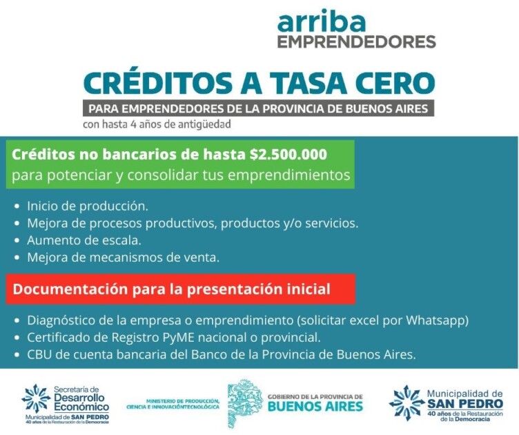 La Municipalidad de San Pedro comparte la iniciativa del Ministerio de Producción de la Provincia de Buenos Aires de otorgar créditos a tasa cero para emprendedores a través del programa «Arriba Emprendedores».