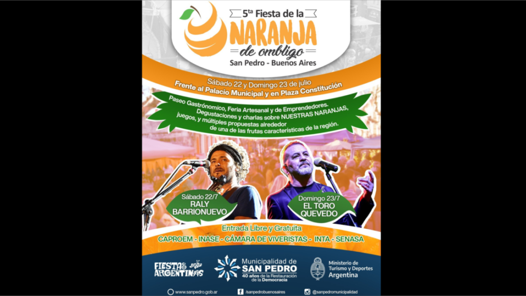 El evento, de entrada libre y gratuita, se desarrollará frente a la Municipalidad y contará con shows en vivo, paseo gastronómico, feria artesanal y de emprendedores, degustaciones y charlas dedicadas a las naranjas sampedrinas, juegos y diversas actividades relacionadas con una de las frutas emblemáticas de la región. Los cierres musicales estarán a cargo de Raly Barrionuevo el sábado y el Toro Quevedo el doming