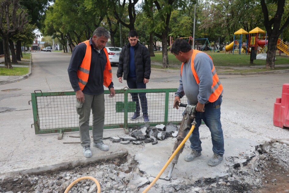La Secretaría de Servicios Públicos lleva adelante trabajos de reparación de calzada en la zona de la Plaza Martín Fierro, mediante una intervención de hormigón más profunda que el bacheo habitual que se realiza en distintos puntos de la ciudad.