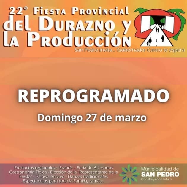 La Municipalidad de San Pedro y la Comisión Organizadora de la 22º Fiesta Provincial del Durazno y la Producción informan que luego de las reuniones mantenidas tras la suspensión de la segunda jornada del evento, se ha logrado reprogramar la grilla artística y las actividades pendientes para el sábado 27 de marzo.