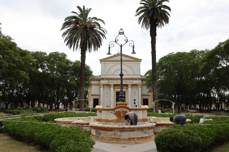 El trabajo incluye el acondicionamiento de la fuente para realizar tareas de aislamiento, reparación de filtraciones y la instalación de sistemas clave, como las conexiones de agua y electricidad. Una vez completadas estas etapas, se continuará con la aplicación de los revestimientos finales y la pintura, tanto de la fuente como del histórico farol que la acompaña.