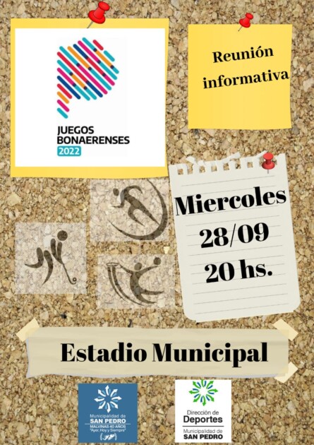 La Dirección de Deportes de la Municipalidad de San Pedro informa que hoy, miércoles 28 de septiembre, a las 20.00 hs se desarrollará en el Estadio Municipal una reunión informativa junto a quienes clasificaron en las distintas disciplinas a la etapa final de la 31° edición de los Juegos Bonaerenses 2022 que se llevará a cabo del 1 al 6 de octubre en la ciudad de Mar del Plata.
