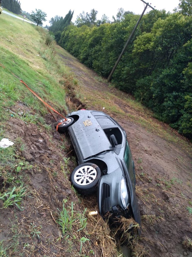 Tras el fuerte temporal un automovil perdio el control y termino sobre una alcantarilla.