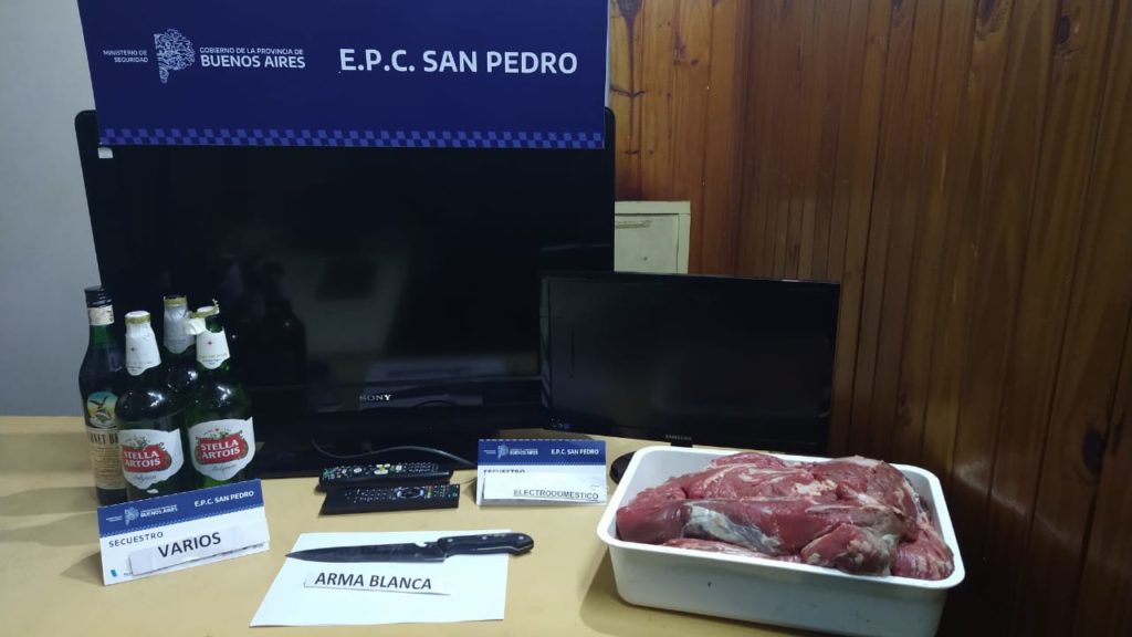 En el mismo momento en el mismo lugar de los hechos se secuestró TV color SONY, monitor de PC marca SAMSUNG , controles remotos, carne (lomitos), bebidas, y cuchilla, que el aprehendido intentaba ocultar en el domicilio, estableciéndose que fueron sustraídos instantes antes interno rdel comercio Mono Bar que estaba cerrado al público ubicado en calle Belgrano al 1900, donde ingresó tras violentar abertura y candados.