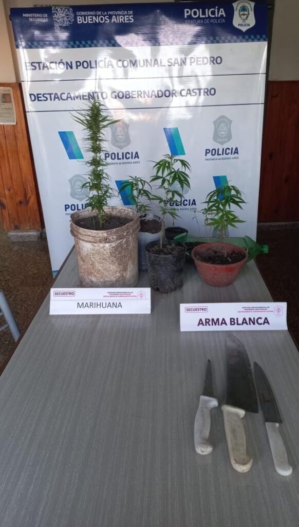 Este miércoles alrededor de las 18:30 HS el personal del Desatcamento de Gobernador . Castro, tras tareas investigativas diligencio allanamiento junto personal GTO San Pedro, calle 9 de Julio S/N, E/ San Nicolás y San Luis, de esa localidad,donde se secuestró, trozo de cuero de vaca, carne vacuna de corte irregular frizada, tres cuchillos carniceros, y 14 plantines de marihuana, aprehendió a un joven de 27 años posterior libertad. INT UFI 05. El hecho inicial fue denunciado los últimos días del mes de octubre, donde productor ganadero, denunció la sustracción de un novillo de 300 kg de interior campo de su propiedad zona rural camino que une Gobernador Castro con Perez Pillan, y se encontraba en etapa investigativa.