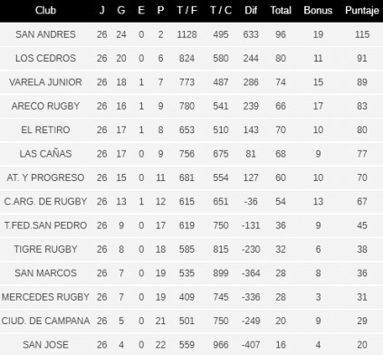 Otros resultados: El Retiro 19-36 San Andrés/ Varela Junior 27-6 Mercedes/ Argentino 36-Ciudad de Campana 29/ Atlético y Progreso 40-41 San Marcos/ Tigre Rugby 23-26 Las Cañas/San José 19-60 Los Cedros.
