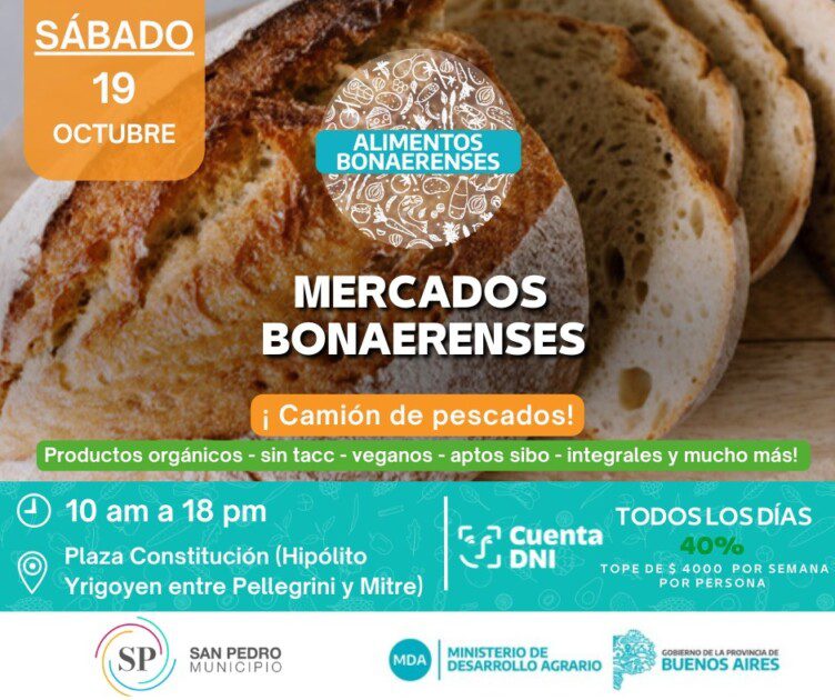 Este sábado 19 de octubre, de 10 a 18 horas, se llevará a cabo una nueva edición de Mercados Bonaerenses en Plaza Constitución (Hipólito Yrigoyen entre Pellegrini y Mitre).