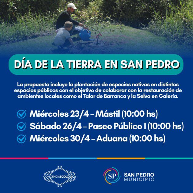 En el marco del Día Internacional de la Madre Tierra, que se conmemora cada 22 de abril desde 1970, la Municipalidad de San Pedro, a través de la Dirección de Medio Ambiente de la Secretaría de Producción, Industria y Comercio, llevará adelante una serie de jornadas conmemorativas en conjunto con la organización civil Conciencia Ecológica.