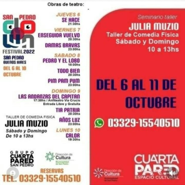 El tradicional festival contará con 10 obras y 1 taller llevado a cabo por Julia Muzio los días sábado y domingo de 10 a 13 hs. Las reservas se realizan al teléfono 03329-15540510