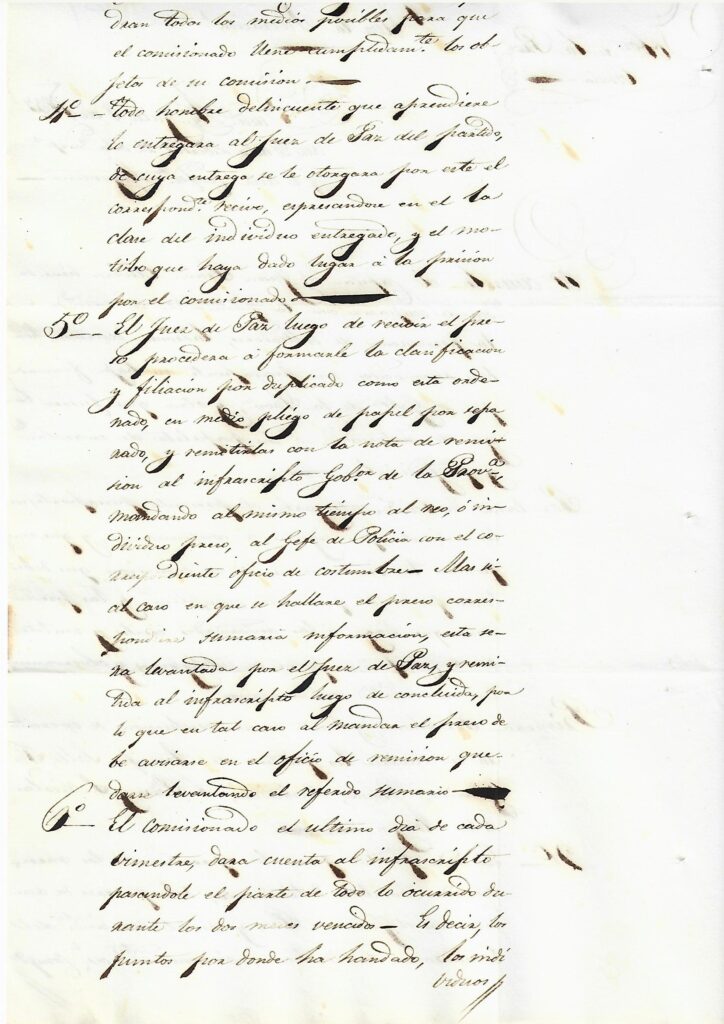 6º El comisionado el último día de cada trimestre, dará cuenta al infrascripto pasándole el parte de todo lo ocurrido durante los dos meses vencidos. Es decir, los puntos por donde ha andado, los individuos que ha preso, las entregas que de ellos ha hecho a los Jueces de Paz, y acompañando los vecinos ellas. Los dichos vimestres vencen en fin de Febrero, fin de Abril, fin de Junio, fin de Agosto, fin de Octubre y fin de Diciembre.