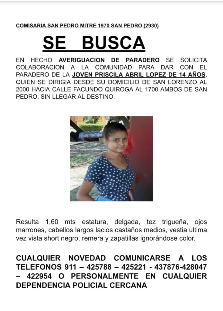 Personal policial trabaja en la búsqueda de una adolescente de 14 años desaparecida desde este martes 14 en San Pedro. Priscila salio desde su vivienda de calle San Lorenzo al 2000 hacia Facundo Quiroga al 1700, pero nunca llego.