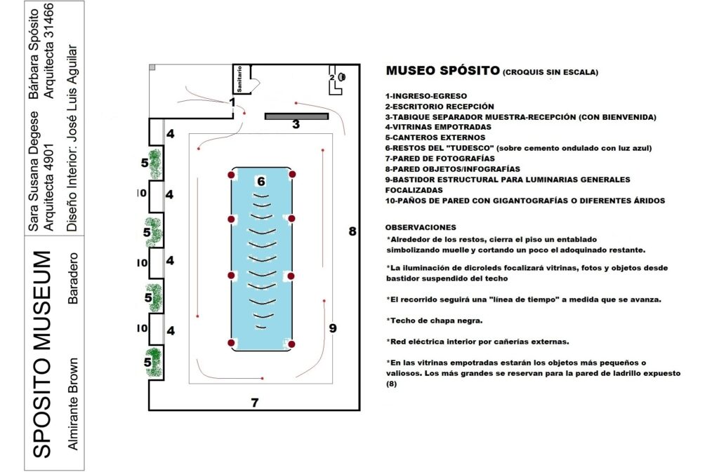 El sector central en desnivel estará ocupado por los restos de la primera barcaza de la empresa: “El Tudesco”. Este navío del siglo XIX del que aún se conserva una parte importante de las maderas que formaban su estructura, es el símbolo del esfuerzo y tenacidad que ha caracterizado a la familia Spósito a lo largo de todos estos años. Estará depositado sobre un piso con ondulaciones, las cuales, con una iluminación apropiada, recrearán el agua del río.