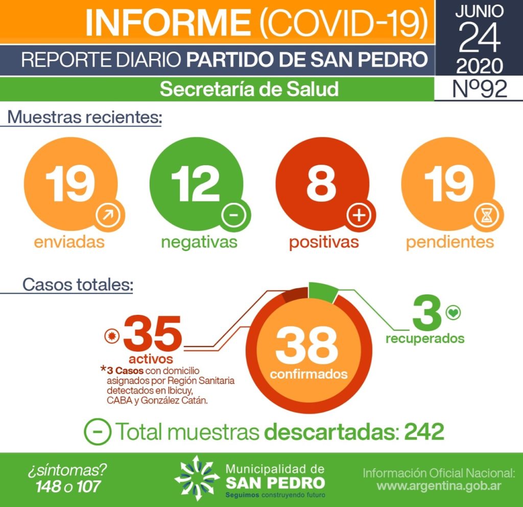 En el resumen oficial se incluyen además tres casos que son asignados por Región Sanitaria a San Pedro y que pertenecen al oficial de Prefectura que trabaja en Ibicuy (Entre Ríos) y cuenta con domicilio en San Pedro, a una mujer personal de salud que trabaja en Ciudad de Buenos Aires y vive en San Pedro, y a un hombre también personal de salud que trabaja en González Catán y reside en nuestra ciudad.