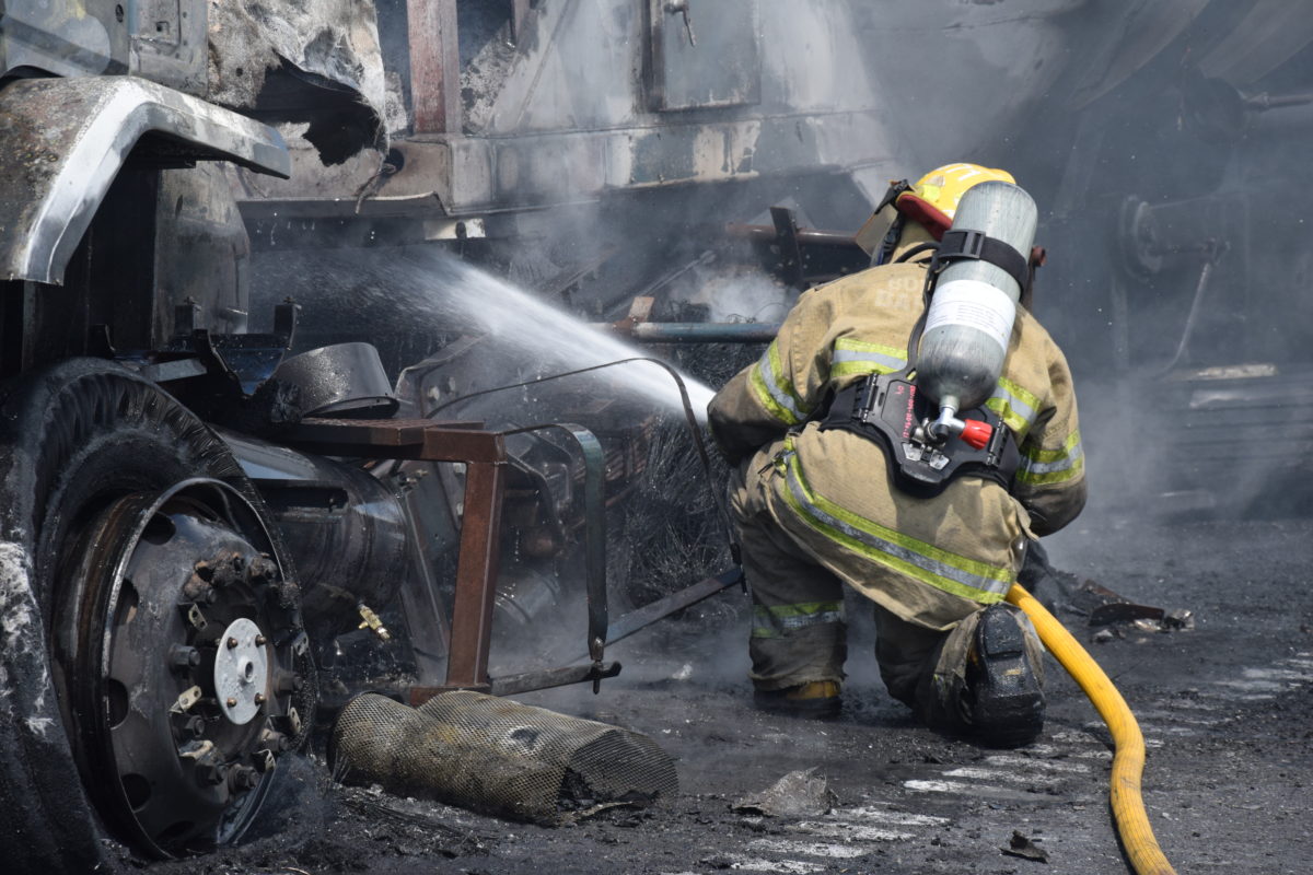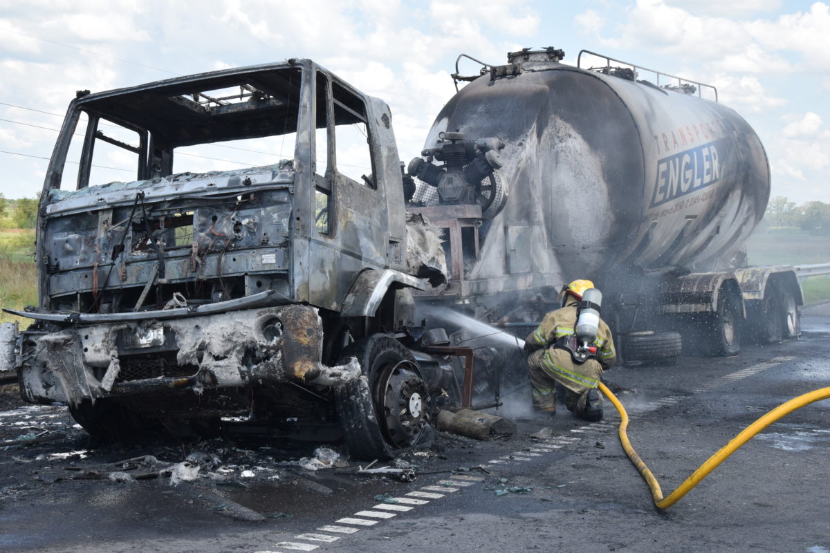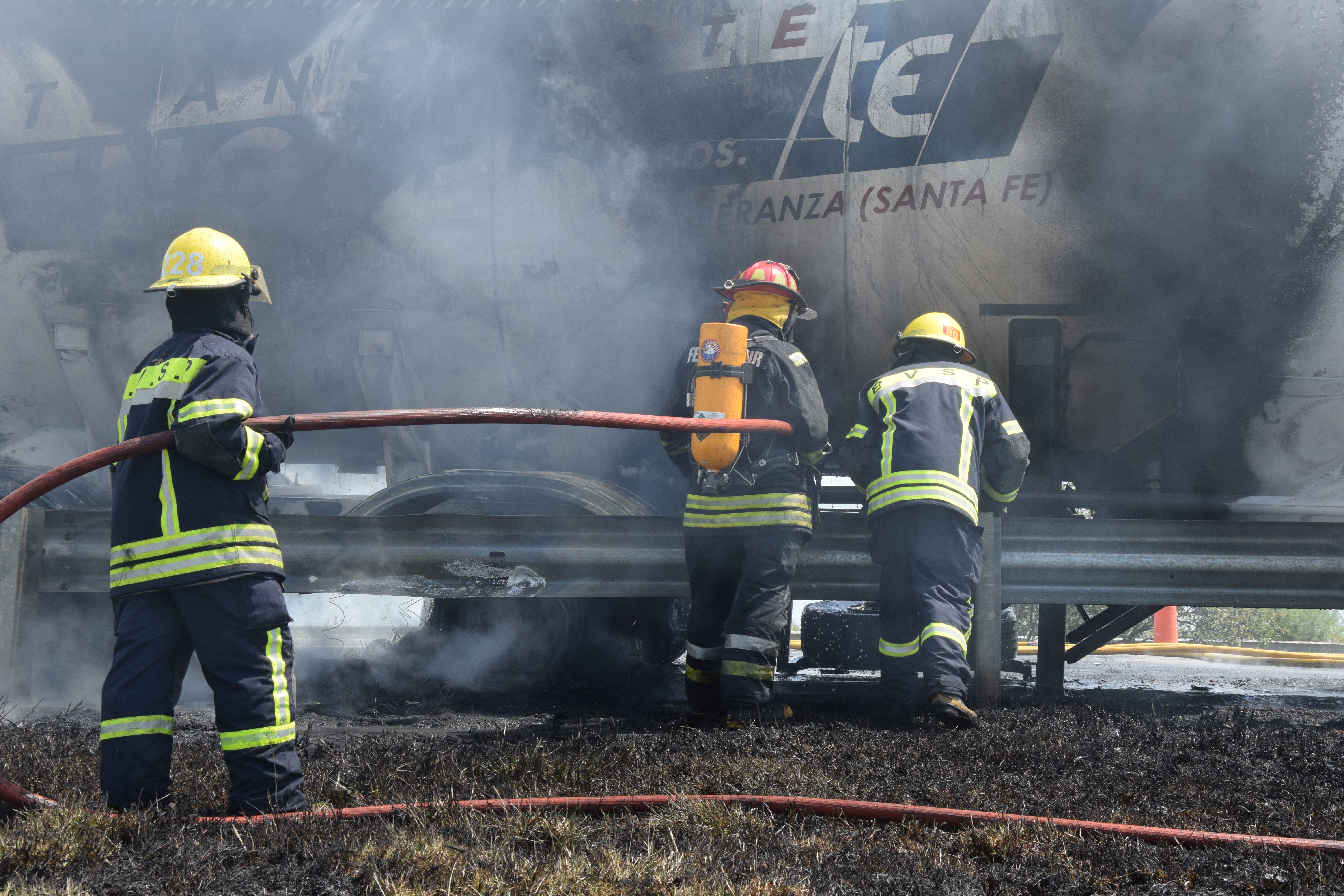 El siniestro ocurrió en la ruta nacional 9 km 145 carril Rosario – Buenos Aires con un camión que transportaba cemento luego de una explosión comenzó a incendiarse.