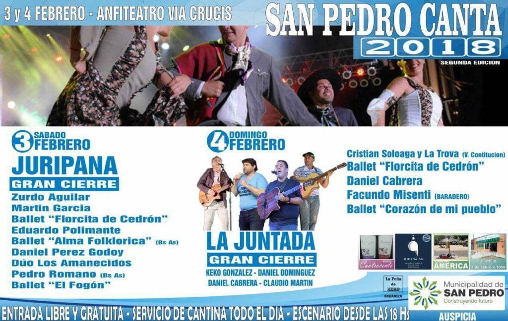 Comenzará a las 18.00 hs con el Ballet “Corazón de mi pueblo” de la ciudad de Santa Lucía. También se presentarán Facundo Vicenti (Baradero), Daniel Cabrera y Claudio Martin y Daniel Dominguez (San Pedro), el Ballet Florcita de Cedrón, Cristian Soluaga y la Truba de Villa Constitución y, para finalizar se organizó una “Juntada sampedrina” en la que se presentarán la banda del organizador acoplada a cuatro cantores y músicos invitados.