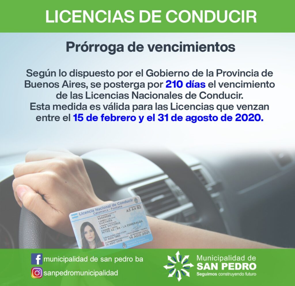 Según lo dispuesto por el Gobierno de la Provincia de Buenos Aires, se posterga por 210 días el vencimiento de las Licencias Nacionales de Conducir.Esta medida es válida para las Licencias que venzan entre el 15 de febrero y el 31 de agosto de 2020.