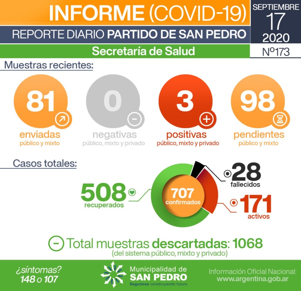 En San Pedro al día de la fecha se registran 171 casos activos y están pendientes 98 muestras.