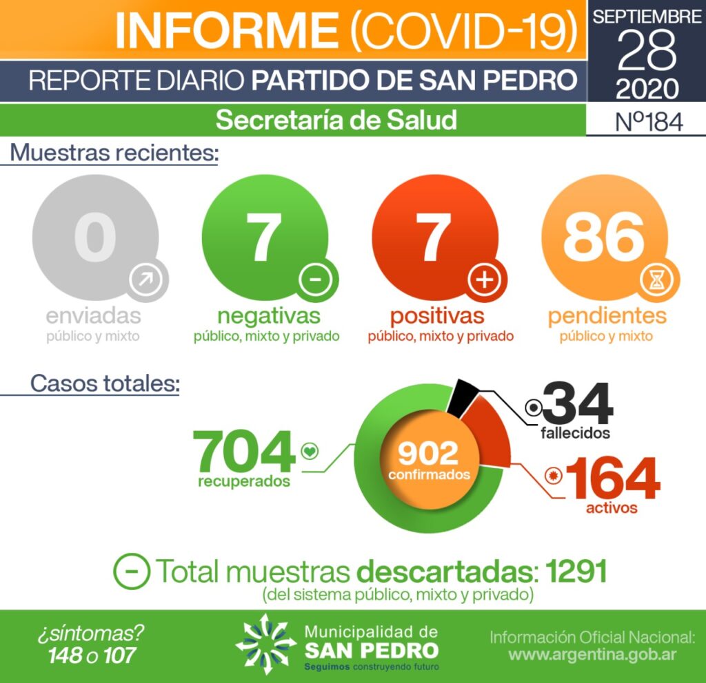 En San Pedro al día de la fecha se registran 164 casos activos y están pendientes 86 muestras.