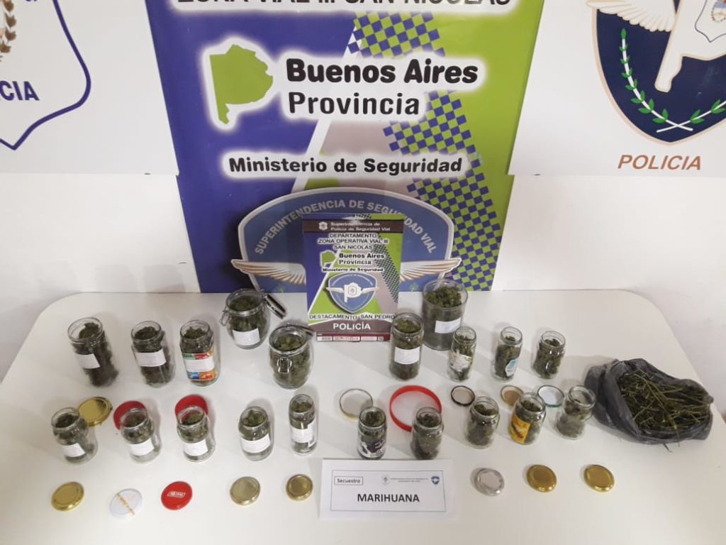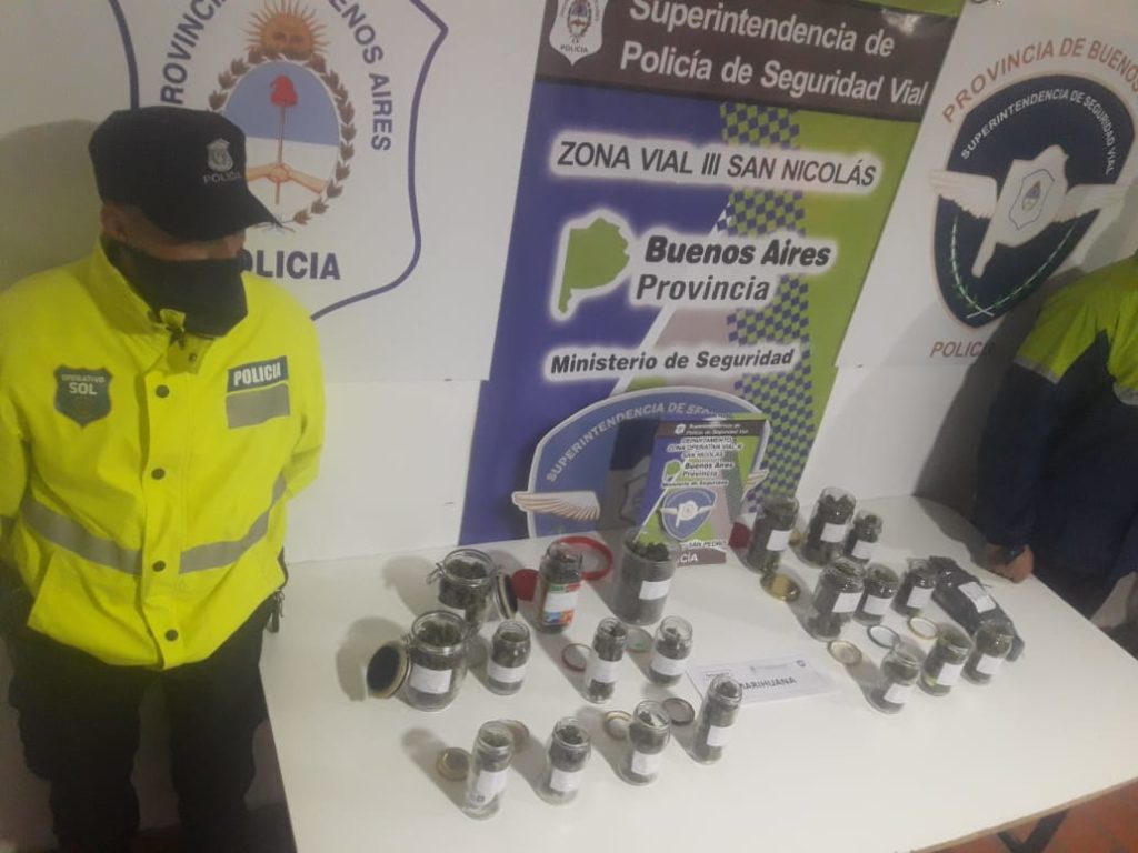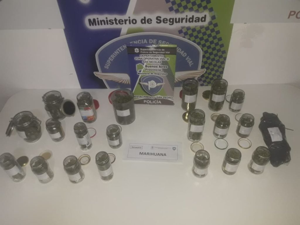 En esta ocasión en la jornada de este domingo por la tarde se realizó la aprehensión de una ciudadana de 47 años, que viajaba de Córdoba a Buenos Aires, en un vehículo Peugeot 208 color bordo, al momento de requisa, en presencia de testigo, se le incautó 19 frascos de vidrio y 1 de plástico, diferentes tamaños. conteniendo sustancia vegetal similar a marihuana denominado cogollos, y una bolsa de nylon negra conteniendo misma sustancia, con un total de 424 grs.