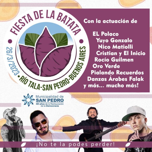 La localidad continúa los preparativos para el desarrollo de la Fiesta de la Batata 2023 que se realizará el domingo 26 de marzo y contará con las actuaciones de El Polaco, Nico Matiolli, Cristian y el Inicio, Rocío Guilmen, Oro Verde, Pialando Recuerdos, Danzas Árabes Falak y espectáculos para toda la familia.