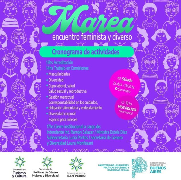 El próximo sábado 23 de abril se concretará en San Pedro «Marea», el primer encuentro Feminista y Diverso de la Región 2, organizado por el ministerio de las Mujeres, Políticas de Género y Diversidad Sexual de la provincia de Buenos Aires, en conjunto con la secretaría de Políticas de Género, Mujeres y Diversidad de la Municipalidad de San Pedro.