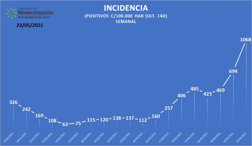 La taza de incidencia de nuestra ciudad fue la semana pasada de 1068 casos detectados cada 100.000 mil habitantes, siendo necesario para volver a subir a fase 3, una taza de incidencia de 350 casos detectados, por lo que por el momento la ciudad esta muy lejos de pasar de fase 2 a fase 3.