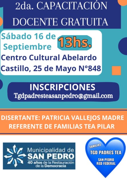TGD padres TEA San Pedro Red Federal, confirmaron que el sábado 16 de septiembre, a las 13 horas, se ofrecerá la segunda capacitación docente gratuita.