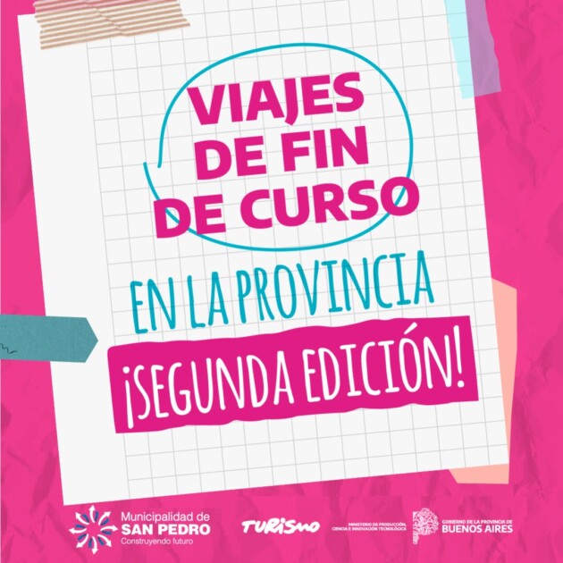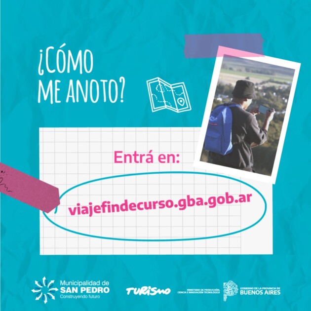 La Municipalidad de San Pedro informa que continúa abierta la inscripción para aquellos estudiantes bonaerenses que se encuentran cursando el último año de secundaria se inscriban en viajefindecurso.gba.gob.ar para poder viajar gratis a un destino de la Provincia durante 4 días y 3 noches, entre septiembre y noviembre. Hotel, micro, comidas y excursiones; todo incluido. En la costa, el río o en las sierras.