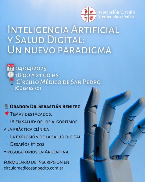 El Círculo Médico de San Pedro será sede de un seminario sobre Inteligencia Artificial y Salud Digital, que se realizará el viernes 4 de abril de 2025, de 18:00 a 21:00 hs.
