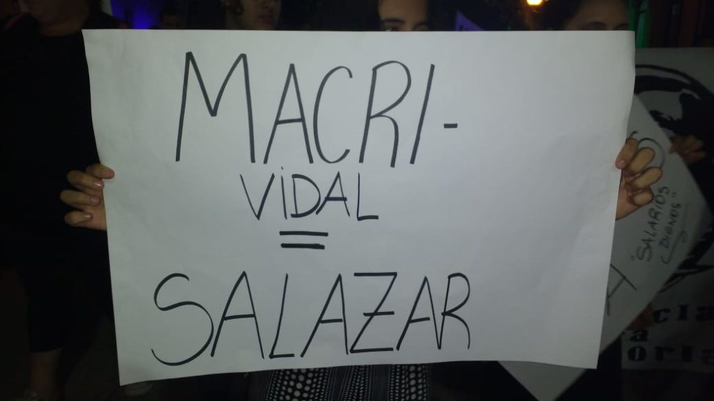 Ademas se hizo escuchar cada vez mas fuerte el típico cantito «Olé, olé, olé , ola .. de tarifazo ya me cansé, andate Macri y llévate a Salazar» por las calles céntricas de nuestra ciudad.