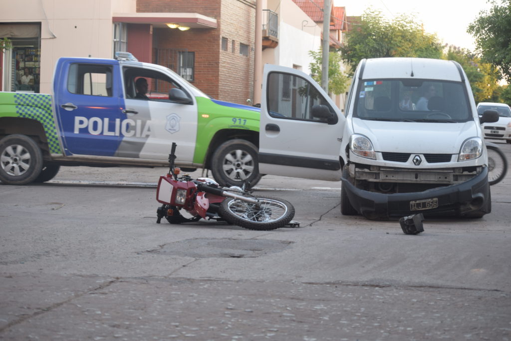 El Accidente se produjo en la tarde de hoy alrededor de las 19:30, en la intersección de las calles Sarmiento e H. Yrigoyen. El accidente tubo lugar entre una moto Mondial 150 cc conducida por una joven y el otro vehículo una Renault Kangoo conducido por un señor mayor de 30 años. aparentemente el mismo se produjo mientras la moto circulaba por Sarmiento cuando es impactada desde el costado por la camioneta que circulaba por la otra calle.