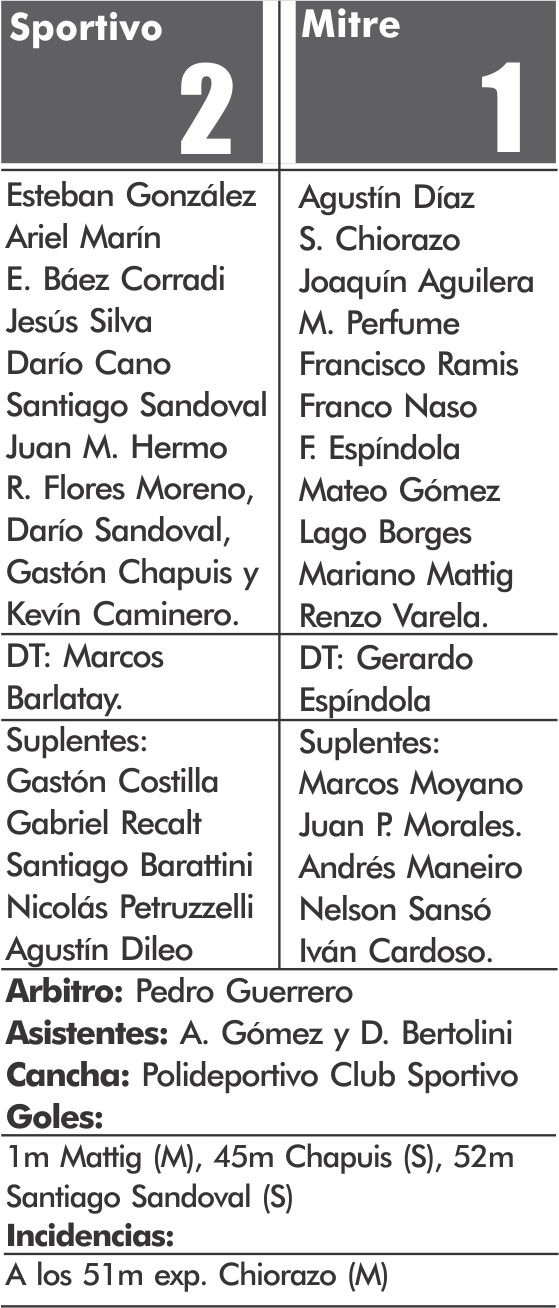 Mitre formó con: Aranda, Ferreyra, Dimitrio, Varela, Campos, Velazquez, Barreto, Rodríguez, Zárate, Pettone y Pereyra. DT: Vives, Ledesma, Guereta y Ojeda. DT: Mariano Arnal