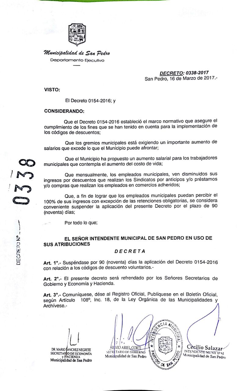 Textualmente el decreto 0338-2017 expresa: