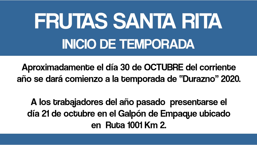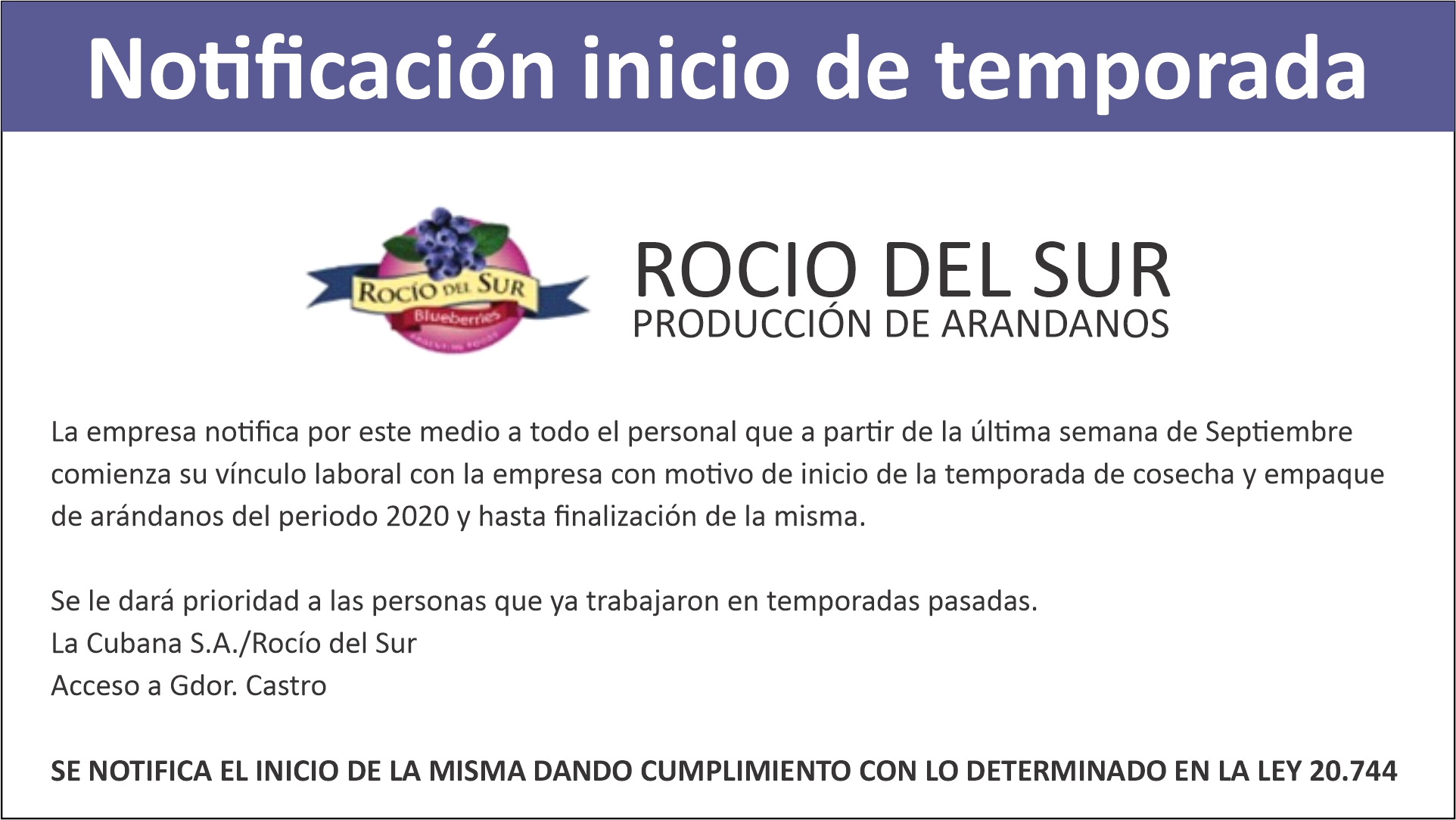 ROCIO DEL SUR. PRODUCCION DE ARANDANOS                                 Notificación inicio de temporada La empresa notifica por este medio a todo el personal que a partir de la última semana de Septiembre comienza su vínculo laboral con la empresa con motivo de inicio de la temporada de cosecha y empaque de arándanos del periodo 2020 y hasta finalización de la […]