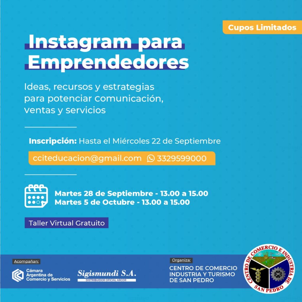 El Centro de Comercio, Industria y Turismo de San Pedro, invita a sus asociados y a la comunidad en general, a participar del segundo taller virtual de capacitación «INSTAGRAM PARA EMPRENDEDORES, ideas, recursos y estrategias para potenciar comunicación, ventas y servicios», que se desarrollarán durante dos martes consecutivos; martes 28 de Septiembre y martes 5 de Octubre, de 13 a 15 hs.