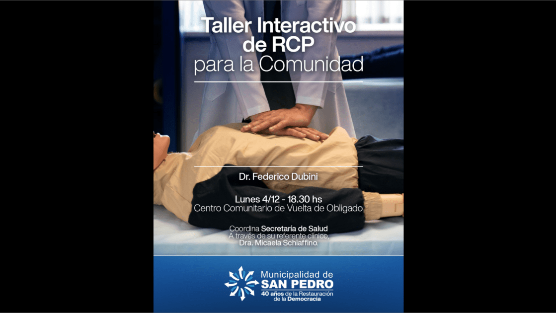 La Municipalidad de San Pedro informa que se desarrollará un taller de reanimación cardiopulmonar (RCP) el lunes 4 de diciembre a las 18.30 hs. en el Centro Comunitario de Vuelta de Obligado.