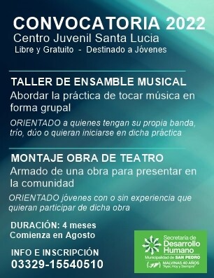 La Municipalidad de San Pedro, a través de la Secretaría de Desarrollo Humano informa que se encuentra abierta la inscripción a los talleres que se desarrollarán en el Centro Juvenil de Santa Lucía, destinado de manera libre y gratuita a los jóvenes de la localidad.