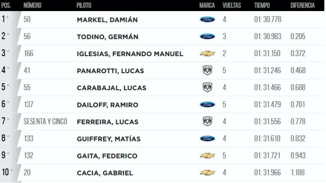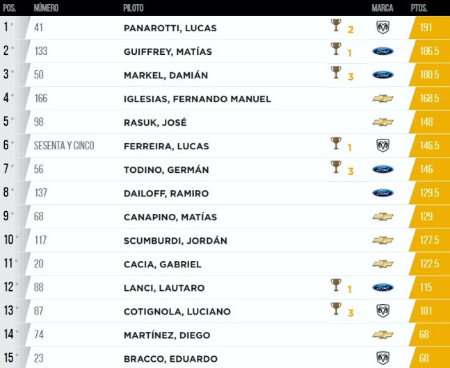 Matías Guiffrey, quien tenía chances de ser campeón, se posicionaba segundo y trató de pasar al líder de la carrera, Lucas Carabajal. Sólo debía alcanzar al piloto de Ford para adueñarse del título, pero no lo logró. Y finalmente, el festejo quedó en manos de Lucas Panarotti.