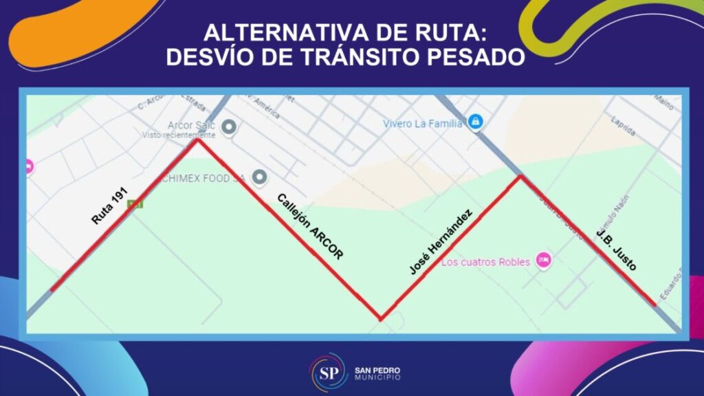 Los vehículos que salen de la ciudad serán desviados por Río Tala, mientras que para el tránsito pesado y camiones, se ha habilitado una vía alternativa: deben tomar por Juan B. Justo, girar a la izquierda por José Hernández, continuar 750 metros y luego girar a la derecha por Callejón Arcor hacia la Ruta 191, saliendo detrás de la fábrica de Arcor.