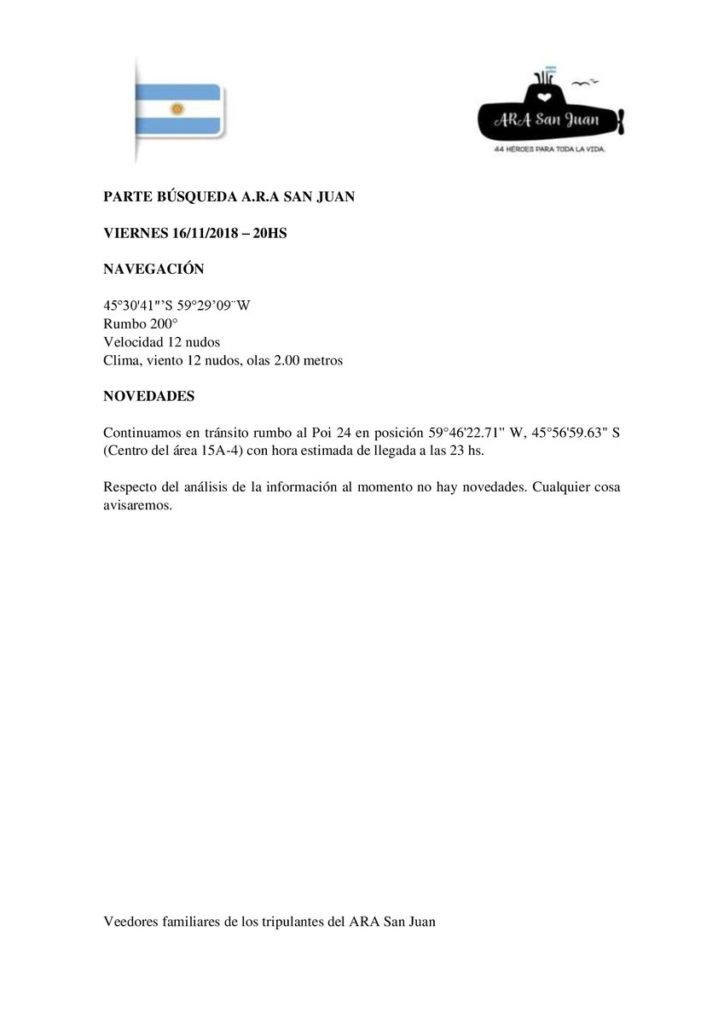 Exactamente 13 horas antes de ese tuit, la cuenta de Los 44 del Ara San Juan había tuiteado el último parte antes del hallazgo. «#ARASanjuan PARTE Nº 154- BÚSQUEDA A.R.A SAN JUAN- viernes 16/11/2018 20HS #presenteslos44delarasanjuan», detallaban, junto a la hoja de ruta del Seabed Constructor.