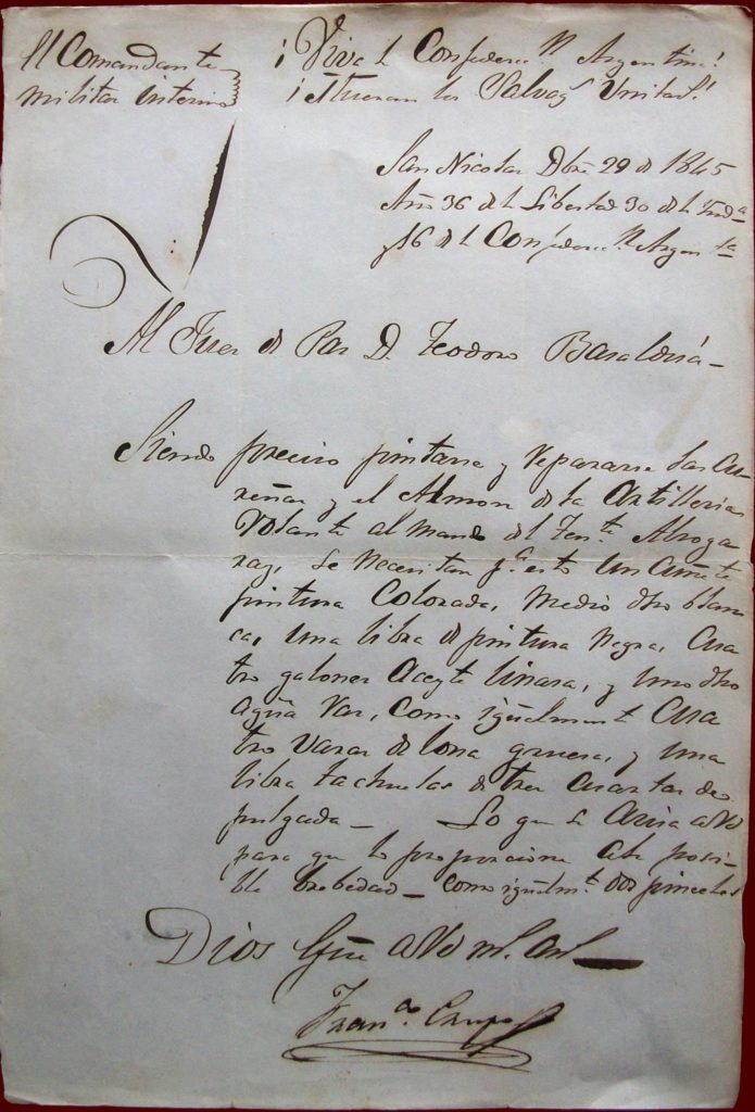 En la primera nota, es el Comandante Francisco Crespo quien solicita al Juez de Paz de San Nicolás, Teodoro Bardoná, la provisión de pintura para `pintarse y repasarse las cureñas y el armón de la artillería volante al mando del Teniente Alzogaray`. En ella solicita pintura colorada, blanca y negra, junto a aceite de linaza, aguarrás, lona y tachuelas. Cierra la nota explicando la urgencia del envío y solicitando, además, los pinceles necesarios para el repintado de la artillería.