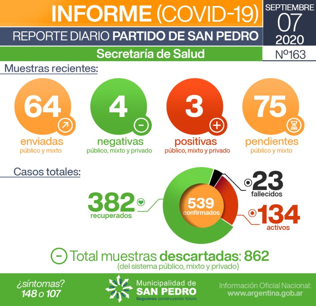 La Secretaría de Salud de la Municipalidad de San Pedro informa que hasta el momento se suman 3 nuevos casos positivos, informados desde los laboratorios que procesan muestras enviadas desde nuestro distrito.