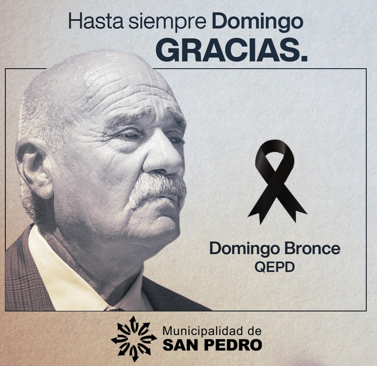 Con profunda tristeza y dolor, la Municipalidad de San Pedro lamenta informar el fallecimiento de Don Domingo Bronce, a los 73 años, después de haber dado batalla contra el Covid-19 y especialmente contra la insuperable pena de haber perdido hace pocos días a su compañera de la vida, también afectada por este virus.