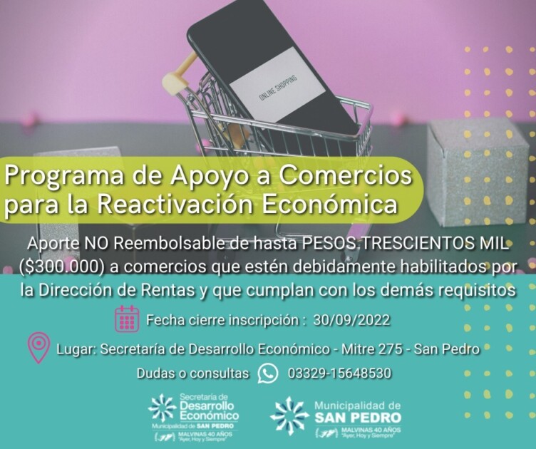 Este viernes 30 de septiembre finaliza la inscripción al programa de apoyo a los comercios lanzado por la Municipalidad de San Pedro, a través de la Secretaría de Desarrollo Económico que consta de una entrega de 300 mil pesos como aporte no reembolsable que podrá ser destinado a la adquisición de mobiliario, refacciones edilicias, compra de insumos o herramientas relacionadas con la actividad que desarrollen.