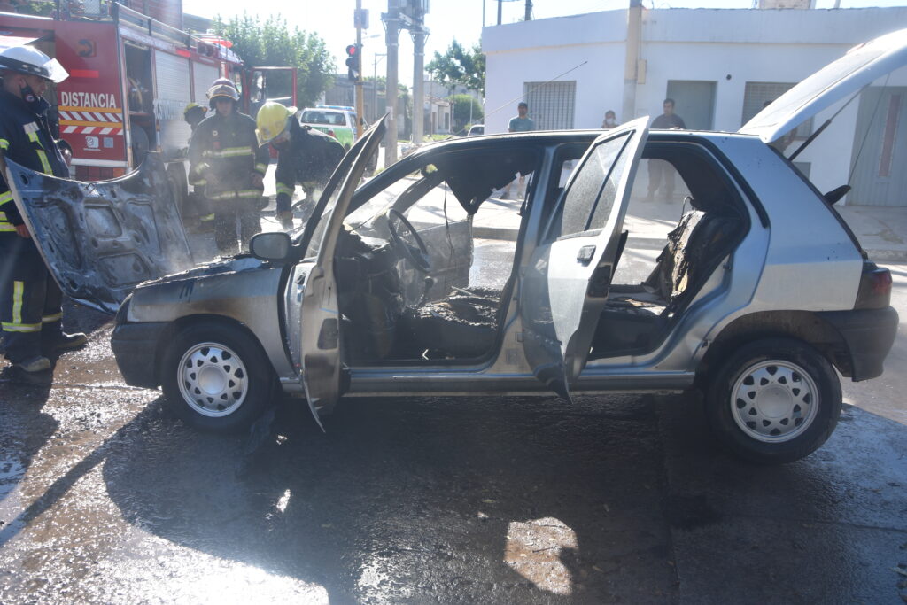 El siniestro ocurrió este sábado pasadas las 08 hs en la esquina de Av. Sarmiento y Caseros donde un automóvil Renault Clio conducido por una mujer sufrió algún desperfecto eléctrico que dio inicio a un incendio, tras varios minutos el vehículo se vio envuelto en llamas.