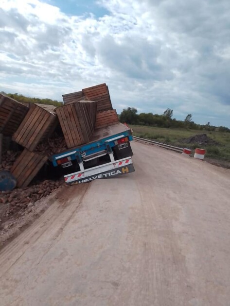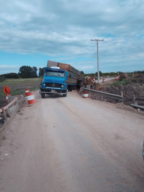 Está mañana volcó un camión en el bajo de Laiz. El camino Lucio Mansilla permanecerá cortado hasta después del mediodía en el desvío, donde se construye un puente.