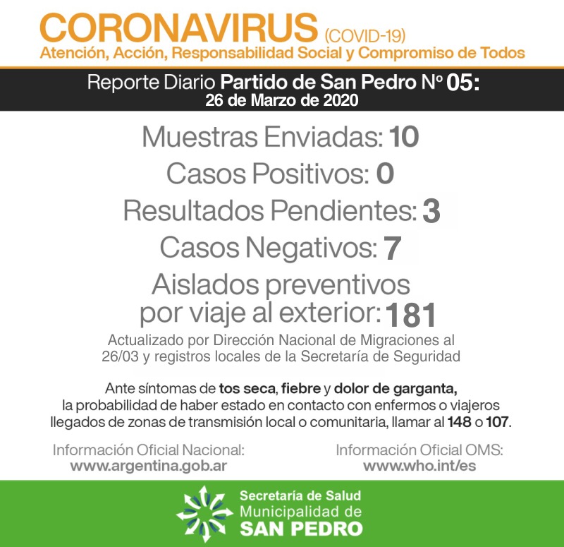 La Secretaría de Salud de la Municipalidad de San Pedro informa las novedades locales relacionadas con el seguimiento de la Pandemia de Coronavirus: