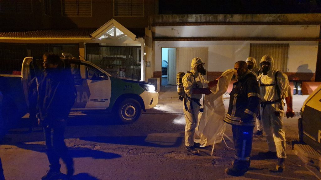 Se solicitó la colaboración de Bomberos Voluntarios quienes disponen del equipamiento para poder ingresar al lugar por el fuerte olor que emana del cuerpo putrefacto que aparentemente llevaba varios días en ese lugar.