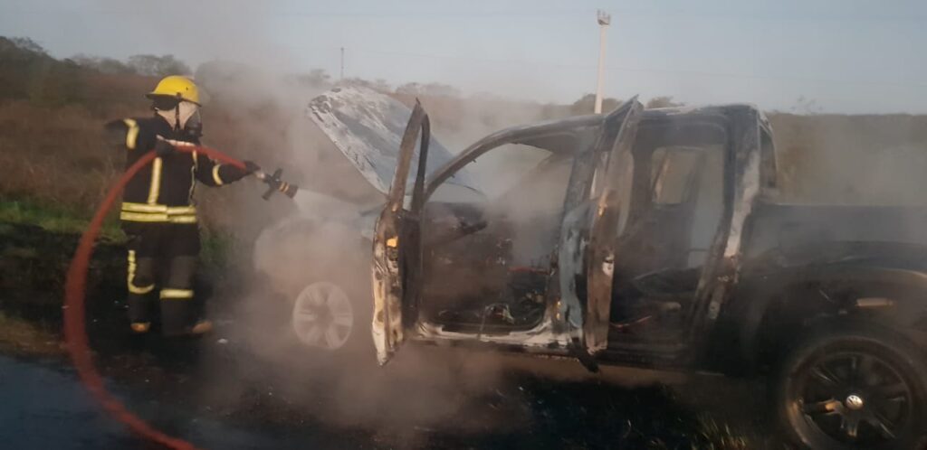 El hecho ocurrió alrededor de las 18 hs en la ruta 191 a pocos kilómetros de la termoeléctrica cuando una camioneta Amarok color negra que venia circulando con dirección hacia nuestra ciudad por motivos que serán de peritaje comenzó a prenderse fuego por lo que su conductor y propietario freno rápidamente quedando completamente en llamas minutos después.