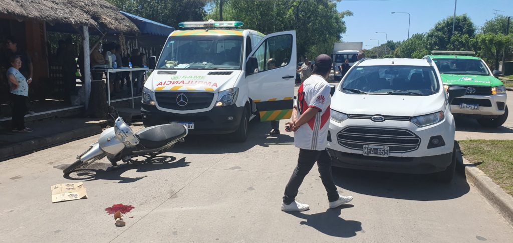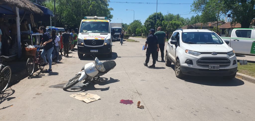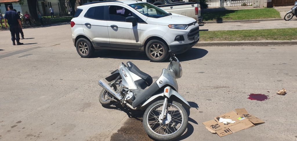 Alrededor de las 12:30 hs de este viernes se produjo un accidente de transito en la esquina de la Av. 11 de Septiembre y Nieto de Torres, donde una mujer de alrededor de 65 años de edad sufrió heridas en su cabeza al no llevar casco cuando conducía una motocicleta Motomel Butz 110 cc color gris y fue impactada por una camioneta Ford Ecosport blanca en el que circulaba una mujer de alrededor de 30 años.